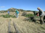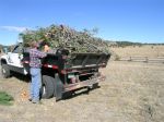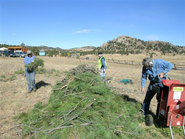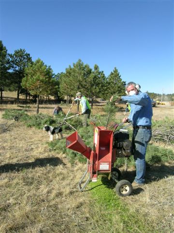 The dense Ponderosa pines SE of Gate 8 were thinned using a chainsaw crew (Jeff, Judd, Odell and Steve). The rest of us hauled large branches to the open work area and then nipped off and sorted out smaller, green branches (dime to quarter diameter), the optimum size for Andre’s process. He and his wife Mary brought chippers to grind the branches and pine needles prior to loading into their truck. Andre said our selected branches were “perfect” raw materials for his process, with a good ratio or “green to brown.” In return for our efforts, Andre paid $100 to the Ecology Committee!