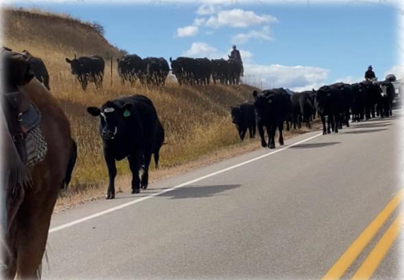Our mountain traffic jam… you are witnessing an old west cattle drive. In early summer and fall cattle are moved up and down the road by cowboys and cowgirls on horseback to graze from Livermore all the way up through Dead Man, Prairied Divide and beyond. It’s more than a cattle drive as every animal is born, raised and finished on the ranch using regenerative practices. It’s a Field to Freezer operation!
