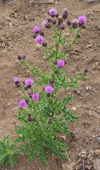 Clusters of Canada Thistle have a complex underground root system from which each individual stalk sprouts and grows, and pulling or cutting one stimulates the others to grow, in an endless cycle of growing denseness and resilience.
