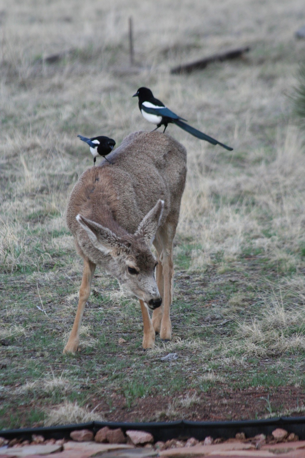 Another common bird is the black-billed magpie. Here you can see them riding the backs of deer to pick off the ticks on the deer’s body. This is a mutualistic relationship. You may also see them on the backs of cattle sometimes.